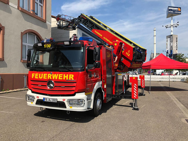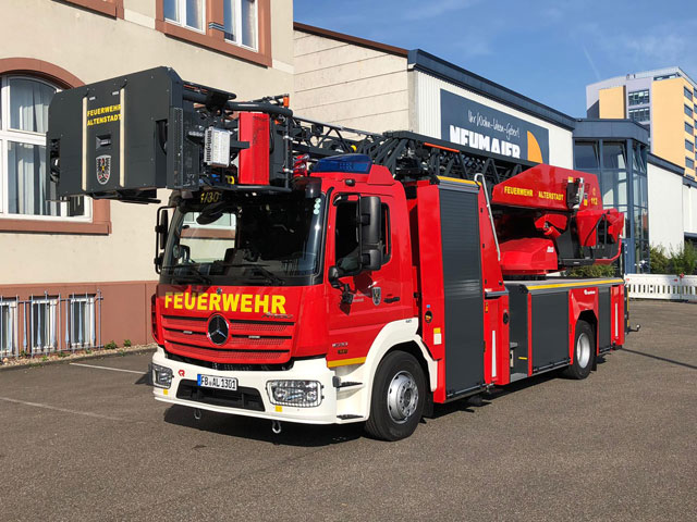 Rosenbauer Aufbau mit Aluminium Profilpodium, neue HLM Ausführung L 32 AXS 3.0 passend zum Mercedes Benz Atego 1530 EURO 6 Fahrgestell mit Allison Automatikgetriebe.