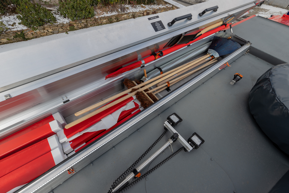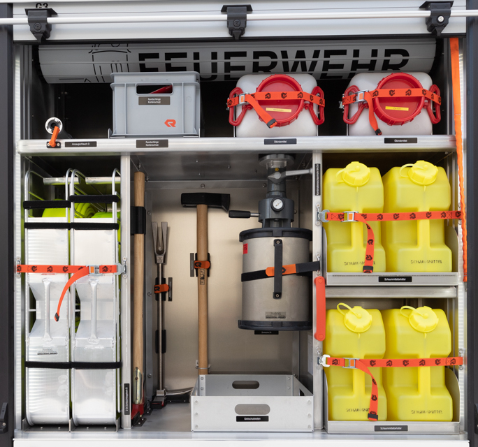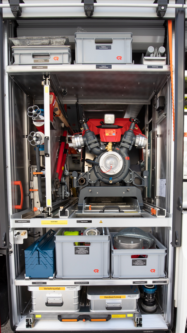 - Schlauchauslegesystem in Tassen im Pumpenraum (15 x B-Schläuche)