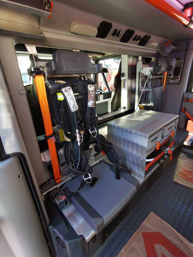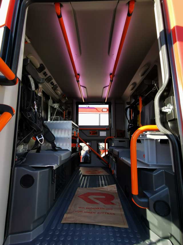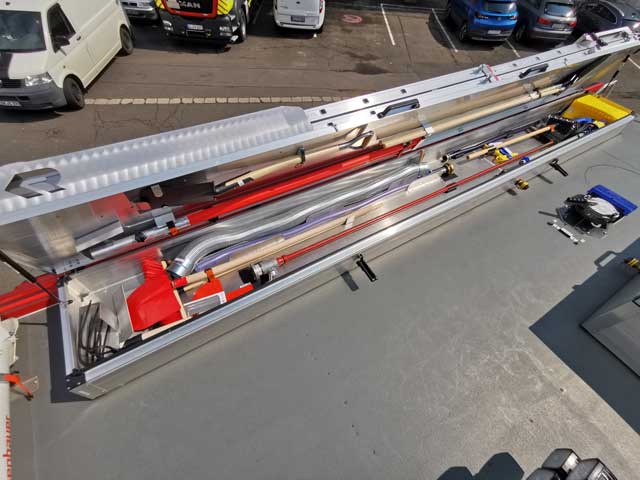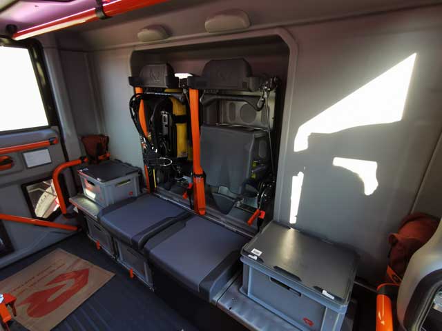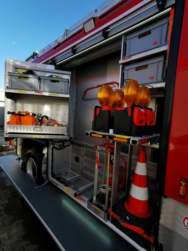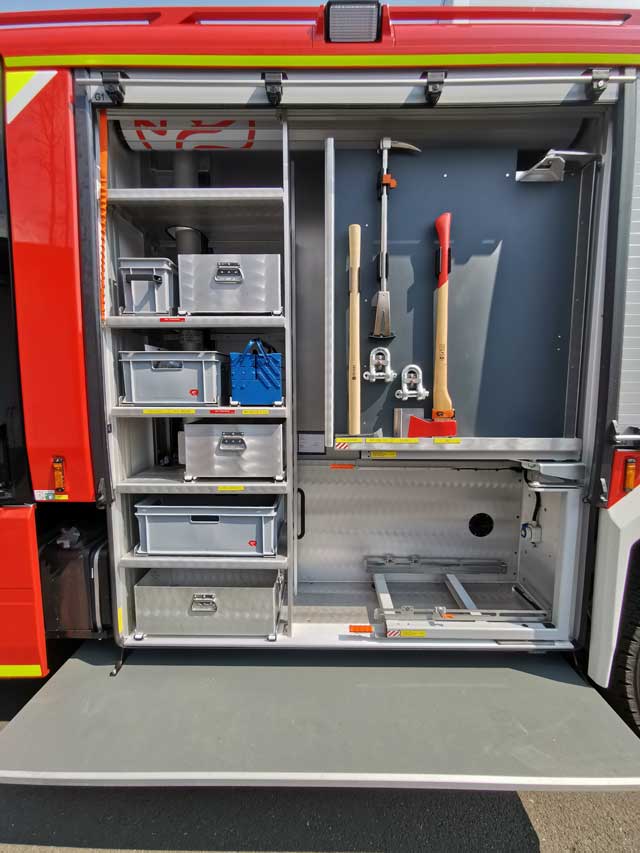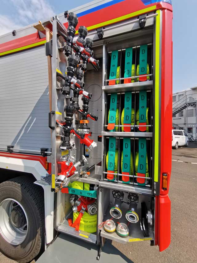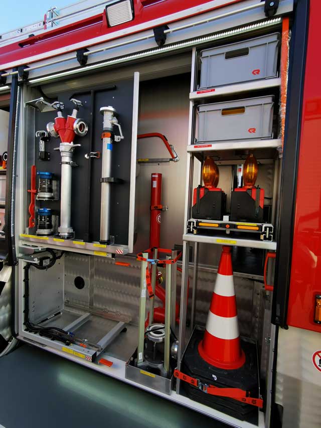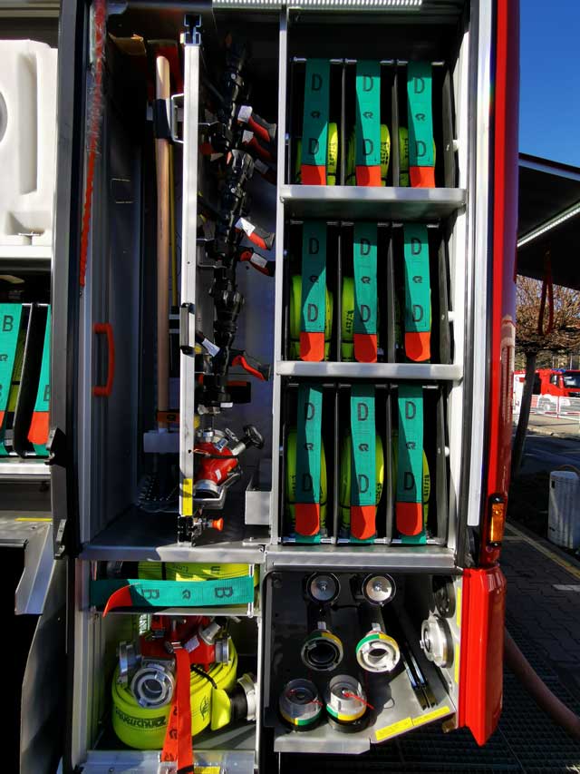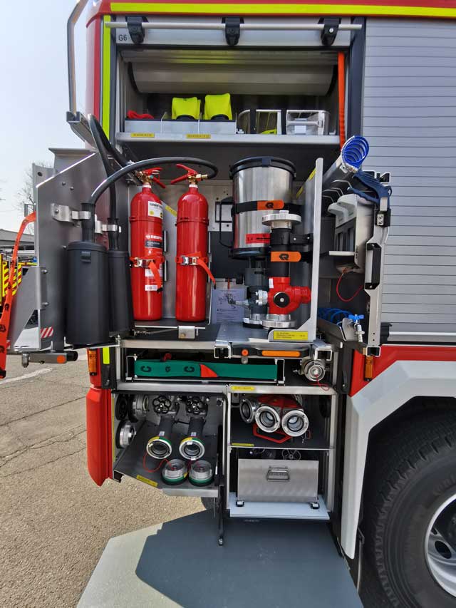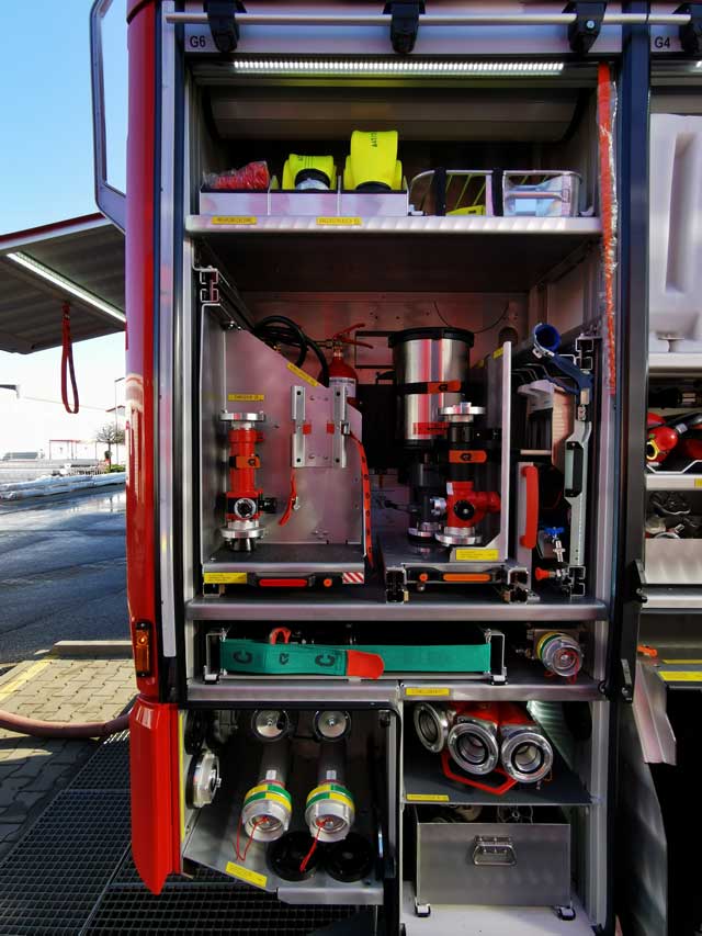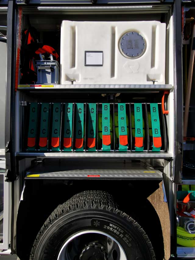 - Ausziehbare Wand mit Löscharmaturen und Waldbrandequipment
