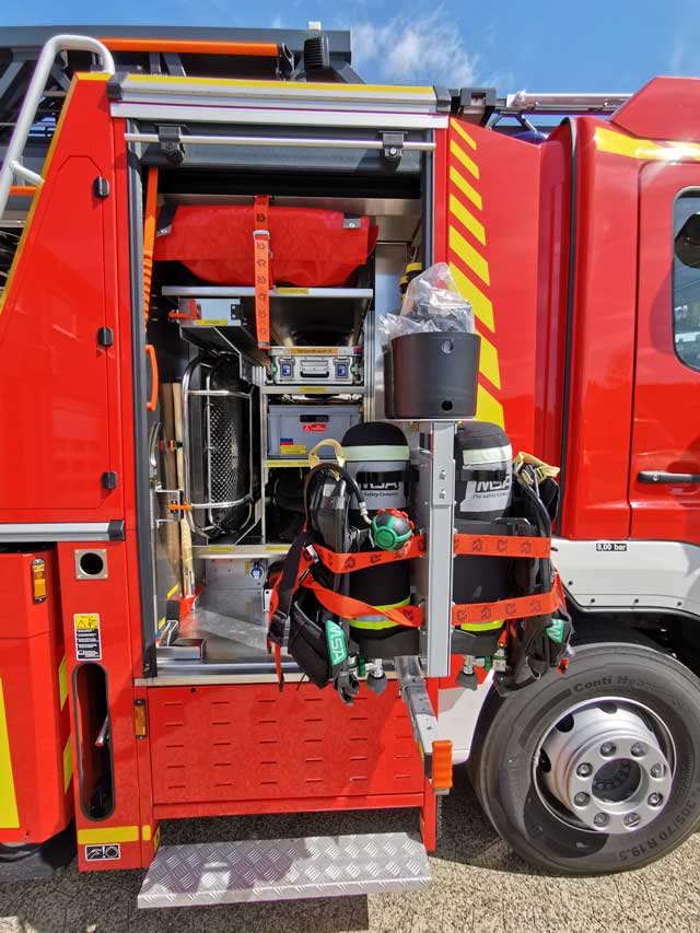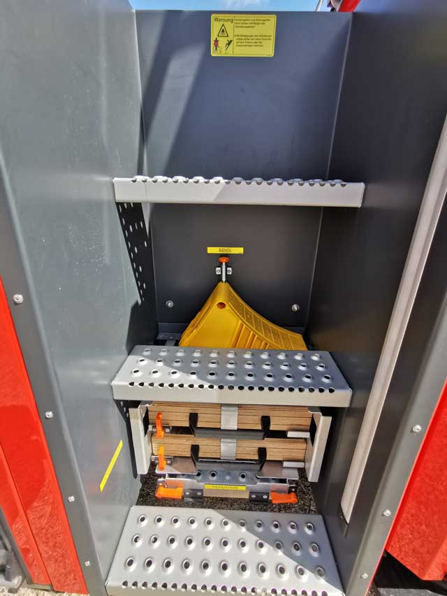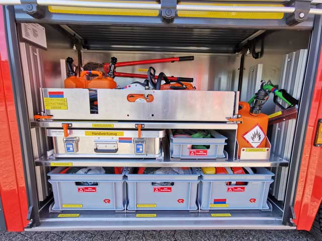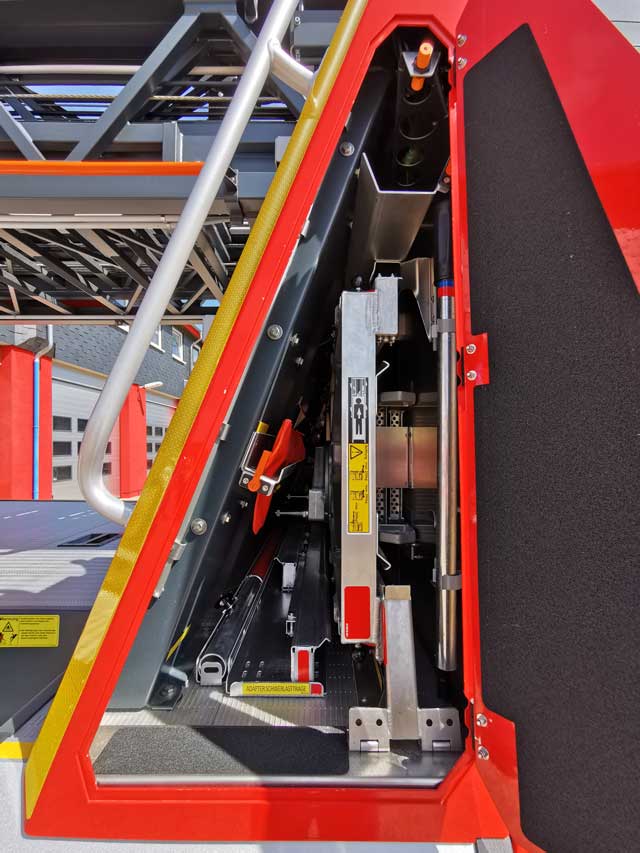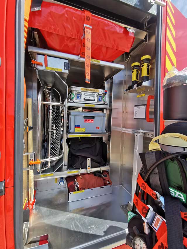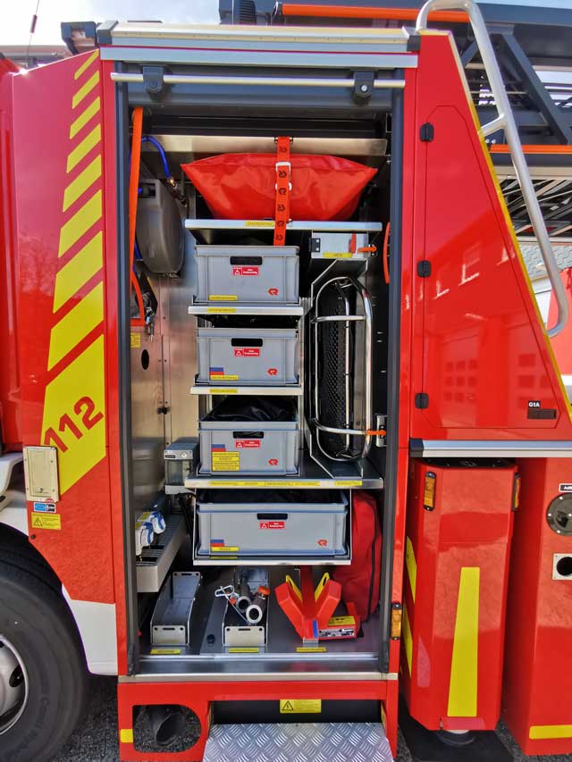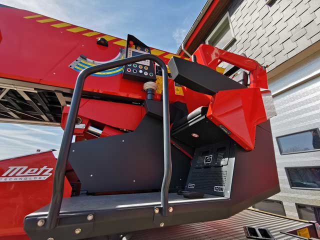 - CAN-Bus-Steuerung der neuesten Generation, hochauflösende LCD-Farbdisplays mit selbstleuchtenden Tastern, im Korb und am Hauptbedienstand (Nachtdesign), im Fahrerhaus befindest sich ein weiteres Display zur Steuerung der Warnanlage und Überwachung des Hubrettungsaufbaues