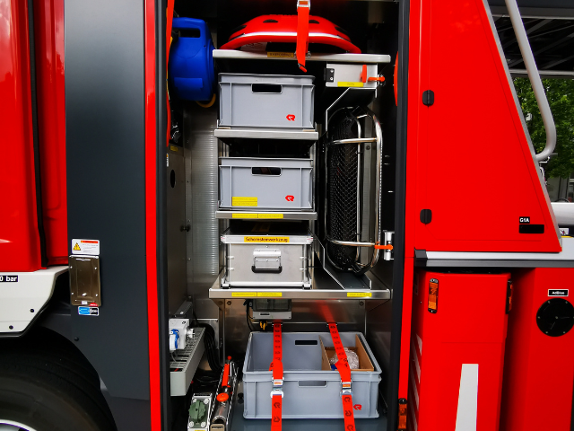 - Staukasten im Korb für Schläuche und Strahlrohr
