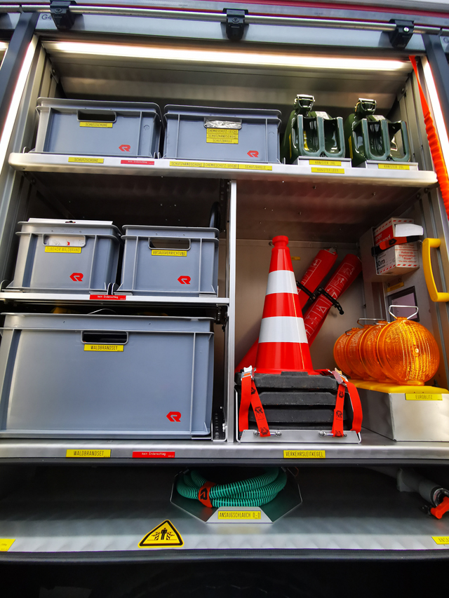 - Diverse Waldbrandausrüstung wie Faltbehälter, Waldbrandkorb, Handwerkzeug
