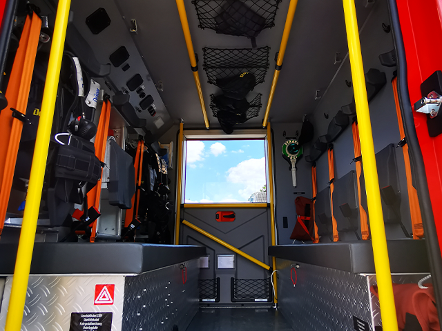 - Gelbe Griffstangen an den Türen, Einstiegen und der Decke